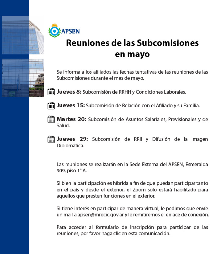 Reuniones de las Subcomisiones en mayo – Comunicación N° 51/2025 https://docs.google.com/forms/d/e/1FAIpQLSe2iiySj8DUm_qykEmp3ApmwMseNDz2w-8HIqNpwb_mLw3nsA/viewform?usp=dialog Sede Cancillería Esmeralda 1212, 1º Piso, Oficina 102, CABA