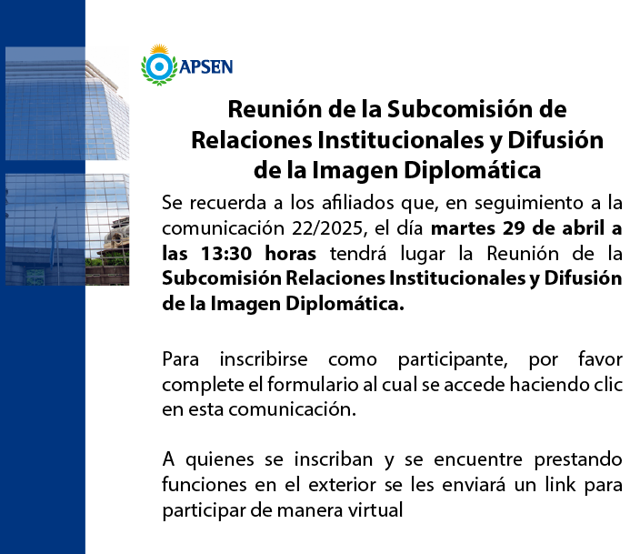 Reunión de la Subcomisión de Asuntos Institucionales y Difusión de la Imagen Diplomática – Comunicación N° 49/2025 https://docs.google.com/forms/d/e/1FAIpQLSe2iiySj8DUm_qykEmp3ApmwMseNDz2w-8HIqNpwb_mLw3nsA/viewform?usp=dialog Sede Cancillería